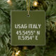 O ornamento de manutenção cerâmica apresenta coordenadas de latitude e longitude para o USAG Itália - Caserma Ederle, Vicenza Itália estilo Estêncil, com letra branca sobre fundo verde do Exército. Personalize com nome e datas atrás.