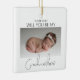 Peça ao seu melhor amigo, irmã ou primo para ser a madrinha do seu bebê com este adorável ornamento de árvore de natal de dois lados minimalista, apresentando uma foto fotíssima do seu bebê, fazendo a pergunta e, do outro lado, outra foto com uma mensagem de modelo, os estilos de fonte e a cor de fundo podem ser alterados clicando no link de personalização posterior após personalização.