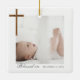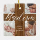 Celebrate a special baptism with this elegant calligraphy photo collage baby keepsake ceramic ornament, inspired by our best-selling invitation design and thoughtfully reimagined as a timeless keepsake. The front features a modern four-photo layout arranged in the shape of a cross in a faux woodgrain texture, with “Baptism” beautifully highlighted in elegant calligraphy font. The back showcases a coordinating faux woodgrain cross, an additional photo, and the baptism date—creating a meaningful memento to cherish for years to come. Design by ©Moodthology Papery