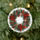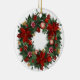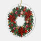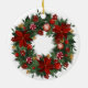 Uma ilustração de arte digital de um Enfeites de natal, com um design de coroa. A coroa é composta por ramos verdes de pinheiros, poinsetos vermelhos, bagas vermelhas, morangos ouros e doces listrados vermelhos e brancos. O ornamento é redondo e branco, com uma corda de ouro no topo para pendurar. O fundo é branco puro. O estilo lembra as decorações clássicas de Natal, com uma reviravolta da arte digital moderna. A paleta de cores é dominada por vermelhos, verdes e dourados, criando uma atmosfera festiva e quente.