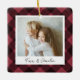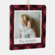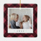 Um adorável ornamento fotográfico de dupla face exibindo uma foto favorita em cada lado, em um fundo de xadrez de búfalo preto e vermelho. Personalize com uma legenda personalizada na frente em letra manuscrita e adicione o ano no verso.