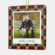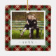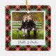 Um adorável ornamento fotográfico de dupla face exibindo uma foto favorita em cada lado, em um fundo festivo vermelho e xadrez verde. Personalize com uma legenda personalizada na frente em letra manuscrita e adicione o ano no verso.
