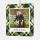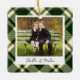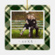 Um adorável ornamento fotográfico de dupla face exibindo uma foto favorita em cada lado, em um fundo festivo de xadrez verde. Personalize com uma legenda personalizada na frente em letra manuscrita e adicione o ano no verso.