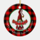 Um gnomo de Natal engraçado e barbudo segura uma corda de poinsettia floresce no centro desta adorável ornamentação de Férias. O pequeno gnomo veste um chapéu vermelho xadrez de Papai Noel com um sino no final. A imagem é colocada sobre um fundo branco e enquadrada em verde de Natal. O texto personalizado em branco na parte inferior diz "Felizes Feriados do (Nome)" em uma borda do círculo de xadrez de búfalos vermelho e preto. A parte traseira tem a mesma imagem e borda com outro campo de texto que você pode personalizar.