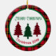 Esta Enfeites de natal apresenta árvores de férias charmosas em xadrezes de búfalos vermelho, preto e verde e preto. Feliz Natal é exibido em rico festivo no topo, com o ano exibido abaixo. Digite o ano atual no modelo ou exclua o texto na parte inferior se não quiser. Uma xadrez vermelha e verde borda o ornamento.
