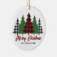 Este presente de Enfeites de natal rústico personalizado apresenta xadrez vermelha e árvores de Natal verdes sobre sua mensagem Feliz Natal. Um bonito olhar personalizado e tradicional que está de novo no estilo, este presente de feriado festivo é perfeito para uma família que gosta de um design clássico e nostálgico.