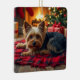 A charming Yorkshire Terrier relaxes by the fire on Christmas Eve. This warm and inviting painting brings classic holiday comfort to any home or gift collection.