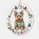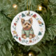 Este enfeite de Natal apresenta uma imagem em aquarela de um adorável cão Yorkshire Terrier vestido com seu suéter de inverno. A imagem está enquadrada dentro de uma grinalda circular colorida composta por várias imagens de Natal, incluindo um boneco de neve, sinos, bengala de açúcar, meia, azevinho e mais! A parte de trás do enfeite tem a mesma imagem de grinalda com seu texto personalizado em verde, dourado e vermelho.