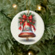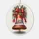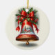 Um sino de Natal ricamente decorado, completo com uma fita vermelha e riscas de Sprigs, enquadra uma cena questil da vila de inverno. A igreja e as casas cobertas de neve evocam uma sensação de nostalgia, enquanto os flocos de neve suavemente caindo somam-se à atmosfera mágica.