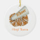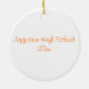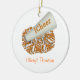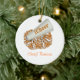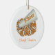 Um ornamento de árvore de Natal em forma redonda, com um pom de laranja e cheerleader branco e um megafone que diz, iCheer, sobre ele. Personalize com seu nome na parte inferior.