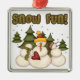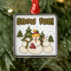 O ornamento de manutenção do Snow Fund apresenta três adoráveis bonitos bonitos homens de neve e árvores verdes e texto que lê "Snow Fun!".
