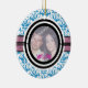 O primeiro ornamento de fotos personalizadas da cor damasco azul do céu azul de Natal do casal. Há um círculo preto e branco para sua foto e uma faixa preta e rosa.