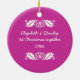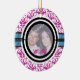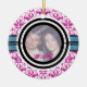 O primeiro ornamento personalizado de fotos cor-de-rosa cor damasco de Natal do casal. Há um círculo preto e branco para sua foto e uma faixa preta e azul.
