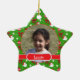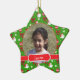 A frente deste Enfeites de natal em forma de estrela fofo tem sua fotografia enquadrada em um fundo verde, vermelho e branco festivo de imagens de Papais noeis, flocos de neve, arcos e ornamentos. O nome do seu filho é colocado em uma placa vermelha brilhante. O outro lado do ornamento mantém seu texto personalizado em vermelho e verde em uma estrela branca colocada sobre o mesmo fundo colorido. É fácil substituir a foto de amostra pela sua; use personalizar para mover sua foto para a melhor posição.