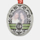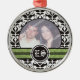Ornamento de fotos de casamento tema damasco preto e branco com sua foto de precioso enquadrada em bandas preto e branco, preto e verde, e suas iniciais em um círculo.