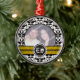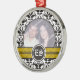 Ornamento de fotos de casamento tema damasco preto e branco com sua foto de precioso enquadrada em bandas preto e branco, preto e amarelo, e suas iniciais em um círculo.