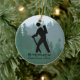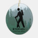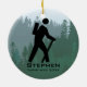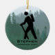 Caminhando pelo Ornament Personalizado Natal 20XX. Hiker se posiciona contra o fundo da floresta. Todo texto personalizável, frente e verso!