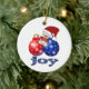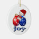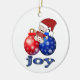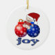 Um bebê com boné de estocagem e bolas de árvores de férias com texto que lê "alegria" em um ornamento que você pode facilmente personalizar para o Natal de 1rua do bebê.