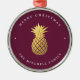 Este elegante ornamento de feriado mostra um abacaxi de aparência falsa de ouro em um fundo burgundy. O texto diz "Feliz Natal", mas você pode mudá-lo para o que quiser.