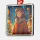 Menina bonito de anime do lado de fora em um Enfeites de natal noturno de inverno.