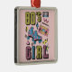 Ilustração colorida com estilo Memphis com design de texto e skate de rolo, caixa de boom, cassete e formas geométricas com "anos 80 Rapariga"