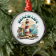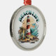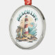 Enfeites de natal temático da praia. Ilustração de uma cena de praia com farol, pranchas, palmeiras e golfinhos.