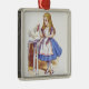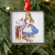 Um ornamento de metal premium quadrado com uma imagem de Alice no País das Maravilhas de Alice em uma mesa segurando a famosa garrafa "beba-me". Veja toda a coleção de ornamentos Wonderland nos TOUCHES ESPECIAIS | Seção Favoritos para festas.