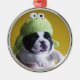Um cachorrinho francês com um chapéu de crochê sapo.
