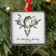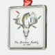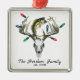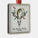 Crânio de veado branco com grandes galhos embrulhados em luzes de Natal. Baco de boca saltando depois da isca de hula. Personalize com seu nome de família e data estabelecida.