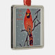 Um desenho gráfico, artístico de uma ave cardeal, vermelha-brilhante, com uma expressão aparentemente, insatisfeita, perches, num galho, enquanto a neve cai, na noite junto com uma frase familiar, feriada.