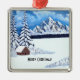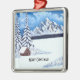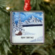 Um ornamento metálico com uma bela cena de inverno, incluindo montanhas de neve, cabana rústica e neve coberta por vergreens. Arte original por W.B.
