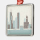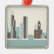 Uma cena retro-denominada do inverno da skyline de Chicago com um casal e um cão que andam ao longo da água.