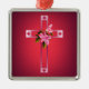 Este ornamento de Páscoa apresenta uma cruz com uma design de recorte em tons de púrpura acentuados por flores de azáleas cor-de-rosa e botões com folhas verdes colocados contra um fundo vibrante vermelho e roxo.
