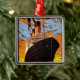 Detalhe a imagem de um poster de viagens do forro de oceano do vintage para a linha de Cunard que mostra o RMS Berengaria no mar em um ajuste gráfico estilizado vìvida colorido.