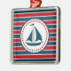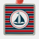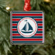Design náutica com decoração de embarcações à vela em forma redonda com estrelas sobre fundo listrado vermelho, azul e branco