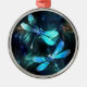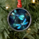 Duas libélulas transparentes, luminosas, turquesas, desenhadas artisticamente sobre fundo noturno, com algas e vagalumes luminescentes do lago. Dragonfly brilhante.