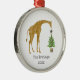 Ilustração de uma girafa derrubando uma árvore de Natal com uma estrela. Personalize com seu nome e ano.