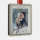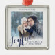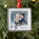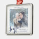 Este ornamento da árvore de Natal oferece um quadro fotográfico quadrado acentuado com a palavra "alegre". A foto aparece com uma borda branca para uma aparência limpa e na moda. Personalize com sua foto favorita e seus nomes.