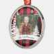 Fazenda rustica, árvore de Natal fresca, com ornamento de manutenção de fotos da família. O ornamento pode ser personalizado com o nome da família, o ano e a foto. Fundo de xadrez de pranchas vermelhas com pinheiros rústicos e flocos de neve. O nome da família é exibido em uma faixa branca. Trabalho de arte por Moodthology Papery.