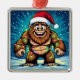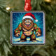 A funny Bigfoot Christmas metal ornament with a comic book style pop art sasquatch smiling with a Santa and Christmas lights on.