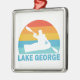 "Conhecido como a Rainha dos Lagos Americanos com suas mais de 109 milhas de costa e mais de 300 ilhas, o Lago George é um paraíso de férias que oferece esportes aquáticos intermináveis, caminhadas, ciclismo e aventuras ao ar livre. Este design de colheita tem cores retrógradas com árvores e um arco-íris."