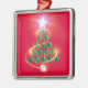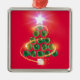 Esta árvore de Natal é especial, pois é projetada com uma colagem de esferas de malaquite com uma base de cristal de quartzo e uma estrela de cristal de quarts em cima. Grelha de ouro cintilante em volta da árvore em um fundo vermelho.
