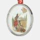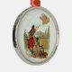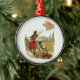 ilustração de pintura vintage para um conto de fadas por hans christian anderson com a filha do sultão em roupa turca vintage, cabelos castanhos longos e pulseiras está ao lado de sua serva que está preparando uma refeição, estão no topo de uma torre onde a senhora está acenando para um homem no céu que está dentro de um tronco voador acenando para ela e vestido com um vestido laranja.