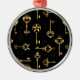 Padrão perfeito de chaves antigas, douradas e silhuetas em fundo preto.