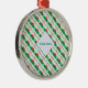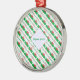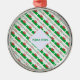 Personalized round metal ornament shows the Welsh flag with the word WALES below, in the colors of the flag, tiled, for a more aesthetic look. A white fractal of squiggly squares holds your name, allowing for a personalized touch or a gift. The flag has a red dragon on a background of green and white.