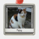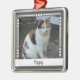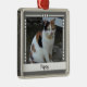 Ornamento da árvore de Natal de um gato de estimação. Substitua a foto e adicione um nome. Cinza e branco com pontos.