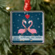 Esta decoração da árvore de Natal apresenta dois flamingos elegantes cor-de-rosa, masculinos e femininos, virados um para o outro, com um coração vermelho pendurado entre eles. O fundo é azul, com flocos de neve brancos. O texto personalizável, numa faixa branca, diz "O nosso Primeiro Natal como o Sr. e a Sra. Jackson".
