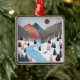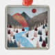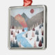 Uma bela paisagem com texturas únicas mostrando um rio e uma paisagem de montanha com uma raposa em caça de salto médio na neve em tons de vermelho, verde, azul e bege.
