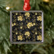 Padrão sem costura com orquídeas pretas e douradas florescendo, ricamente decoradas com galhos de eucalipto pretos e galhos de pistachio de joias delicadas em fundo preto. Orquídea de joias de ouro.