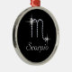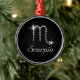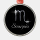 O ornamento circular de brilho cinza apresenta o símbolo zodiaco/astrológico de Scorpio em rochas de diamante em fundo preto. Sinal de nascimento de Scorpio é para aqueles nasceres de 23 de outubro a 21 de novembro